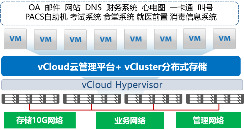 瑞馳根據(jù)醫(yī)院的業(yè)務(wù)需求,將醫(yī)療信息化軟件平臺(tái)部署在瑞馳vCloud超融合架構(gòu)上,以虛擬機(jī)的形式運(yùn)行,能極大的提升硬件利用率、降低運(yùn)維成本。同時(shí),瑞馳超融合架構(gòu)支持萬(wàn)兆互聯(lián)、副本機(jī)制、高IOPS和吞吐量等,在安全、穩(wěn)定的基礎(chǔ)上保障效率優(yōu)先。 此次建設(shè)的超融合平臺(tái)可以支撐醫(yī)院所有輔助管理系統(tǒng)的運(yùn)行,后續(xù)根據(jù)業(yè)務(wù)需要,也可以隨時(shí)對(duì)超融合系統(tǒng)進(jìn)行擴(kuò)容,擴(kuò)容后將支持更多業(yè)務(wù)應(yīng)用。